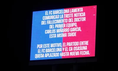 El Barcelona-Osasuna, previsto este sábado en la 27ª jornada de la Liga, fue aplazado debido al fallecimiento del doctor del equipo azulgrana Carles Miñarro García, anunció...