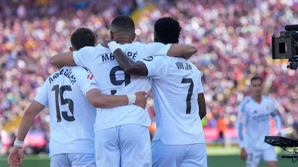 El Real Madrid comenzó adelantándose con un gol de penal de Kylian Mbappé apenas a los 5 minutos de partido tras un derribo del arquero polaco Wojciech Szczesny sobre el francés, quien poco después marcaría el segundo al minuto 14 tras la asistencia de Vinícius Júnior.
