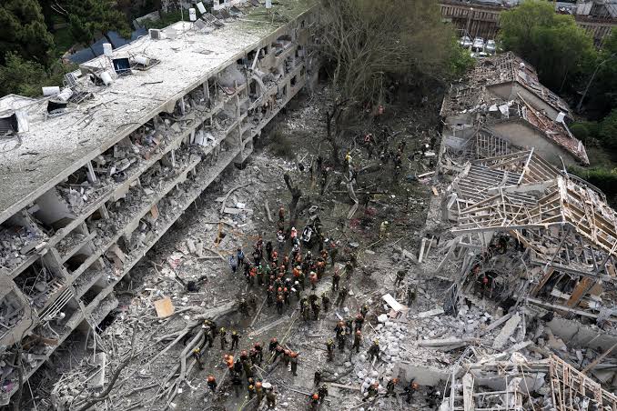 Varios edificios resultaron gravemente dañados en la zona de Ramat Aviv en Tel Aviv, con agujeros en las fachadas de los bloques de apartamentos.