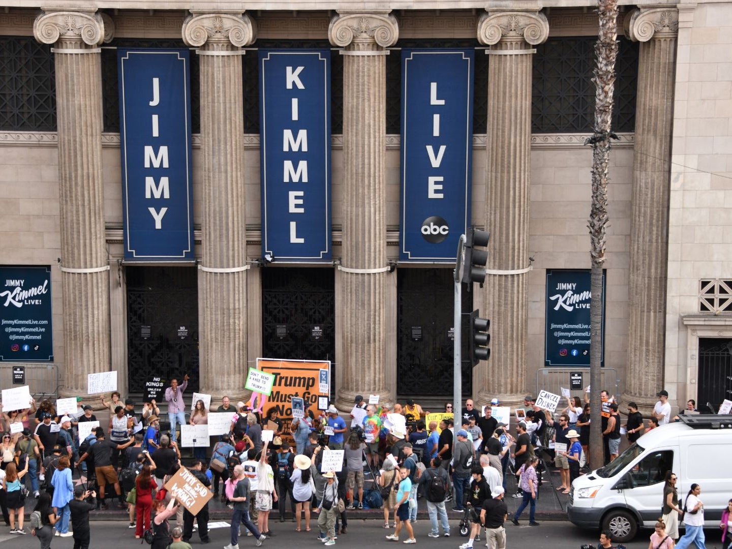 Con pancartas que decían “Kimmel se queda, Trump debe irse”, los manifestantes denunciaron lo que consideran un ataque directo a la libertad de expresión en el país.
